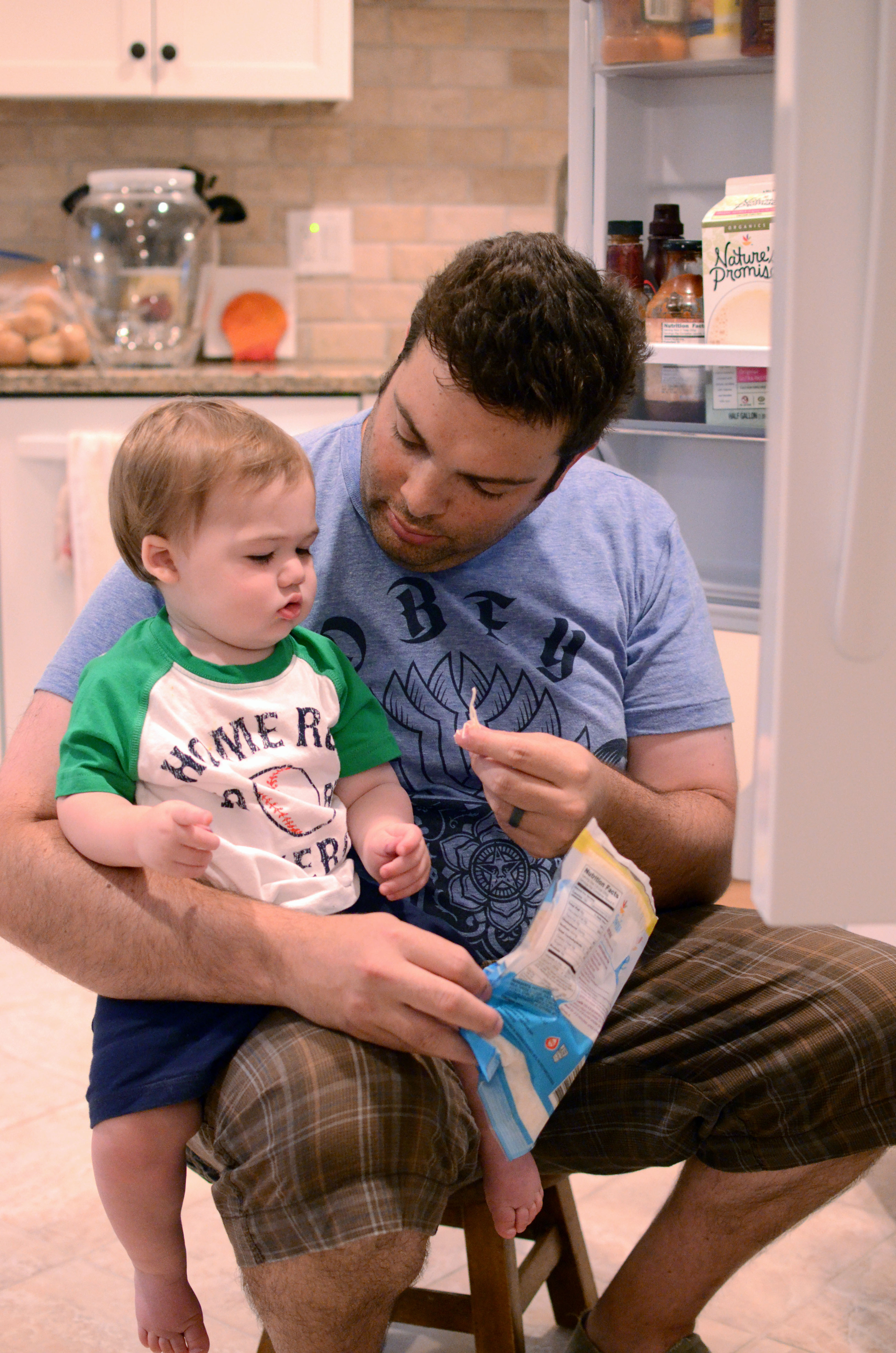 Uncle Opie had fun trying to teach R to appreciate solid food.