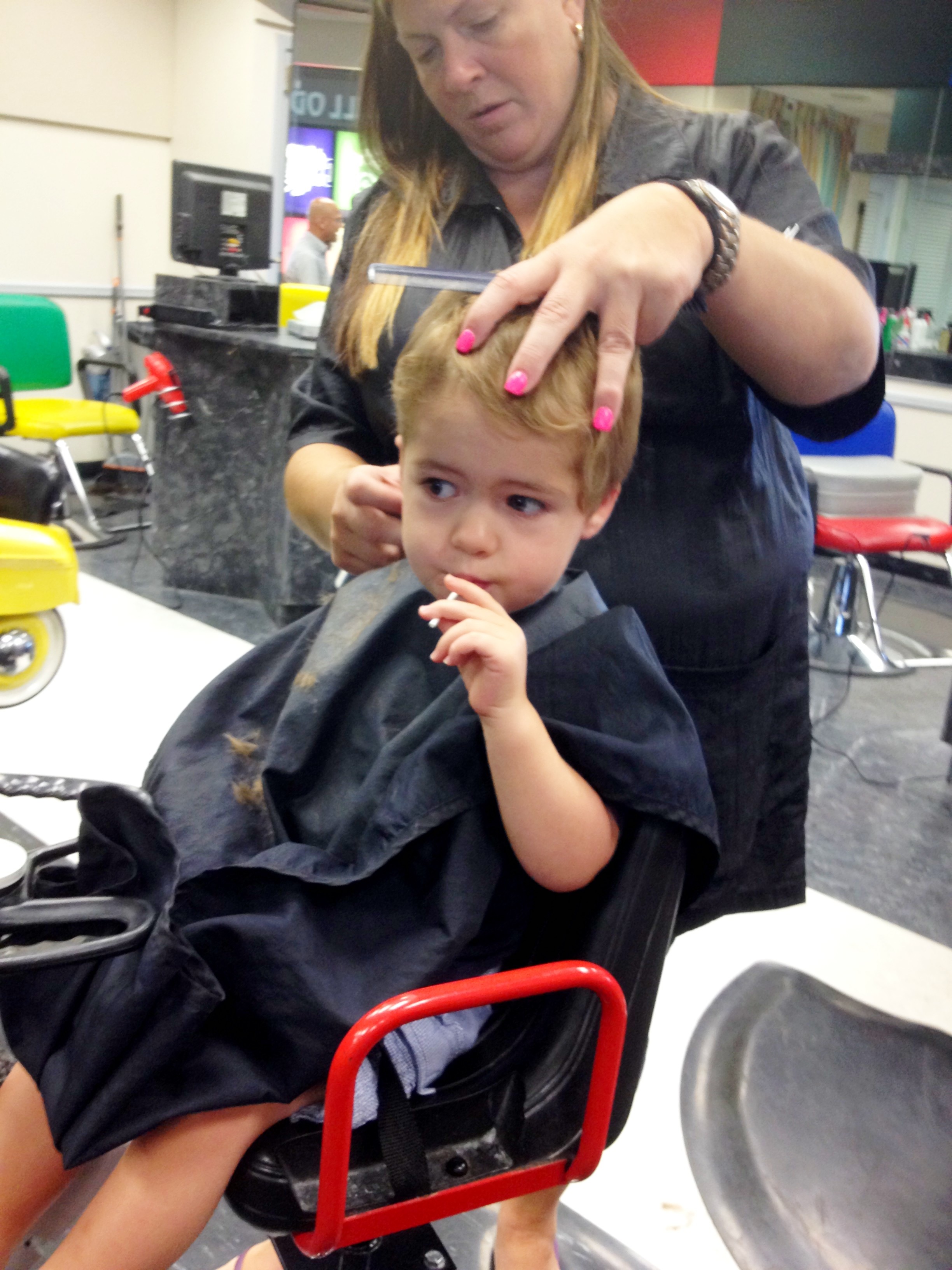 Today was the first time that J sat for his haircut without crying and without me having to constantly pop m&m’s in his mouth to keep the tears and freaking out under control. He just sat there and ate two grape lollipops like it was nothing. It was a proud moment for me, but also a little sad not to feel “needed” anymore. (excuse the low quality iPhone pics)