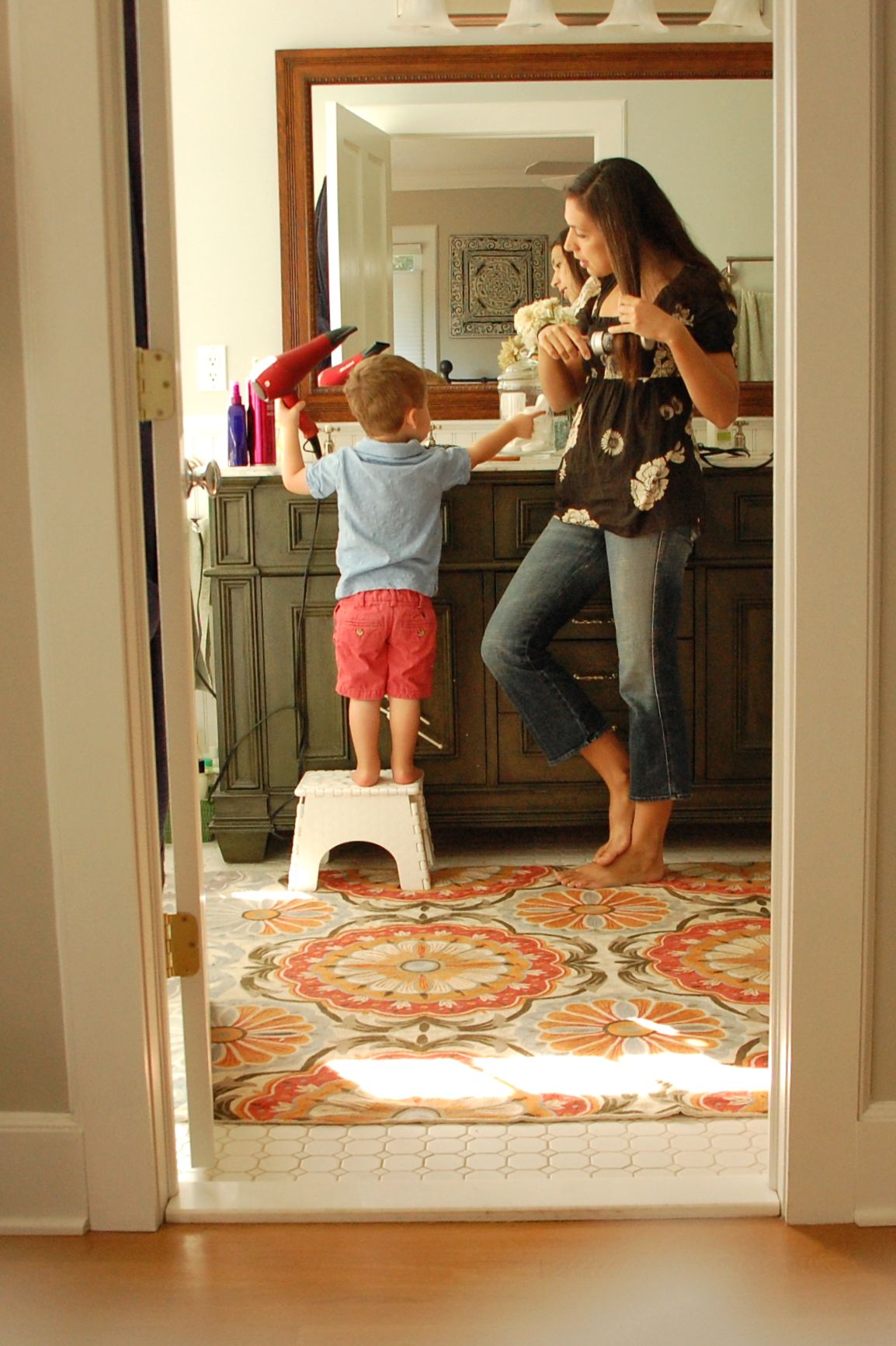 Most mornings, while R is napping, J and I go upstairs “to do makeup” and “to do blow dryer” (as J says it). I think it’s adorable how he gets up on his stool and we stand there getting ready together. He likes to mimic everything I do from brushing my hair to cleaning out my ears with Qtips. On this particular morning, Mama was getting a blowout so Mr J needed one as well.