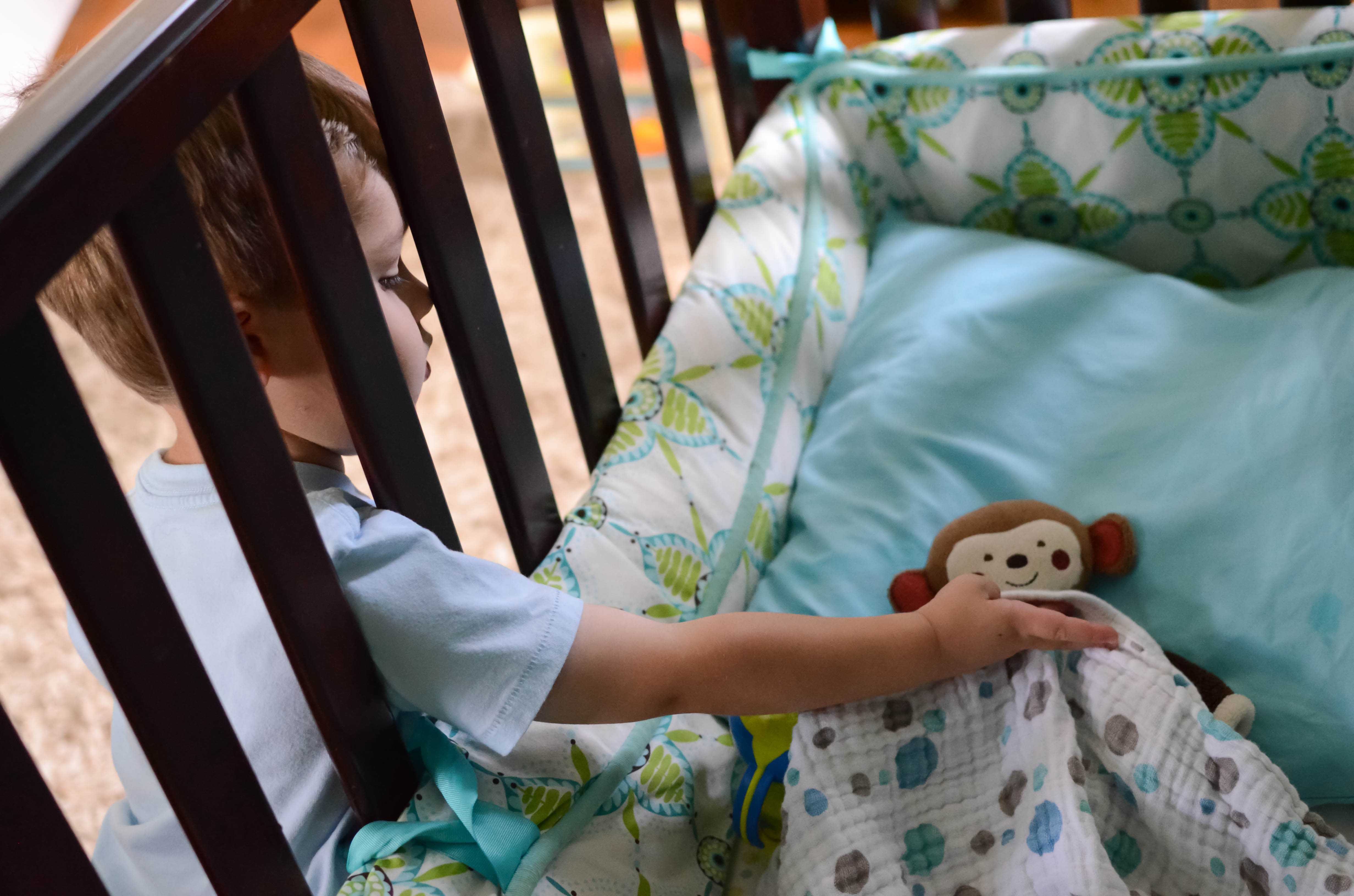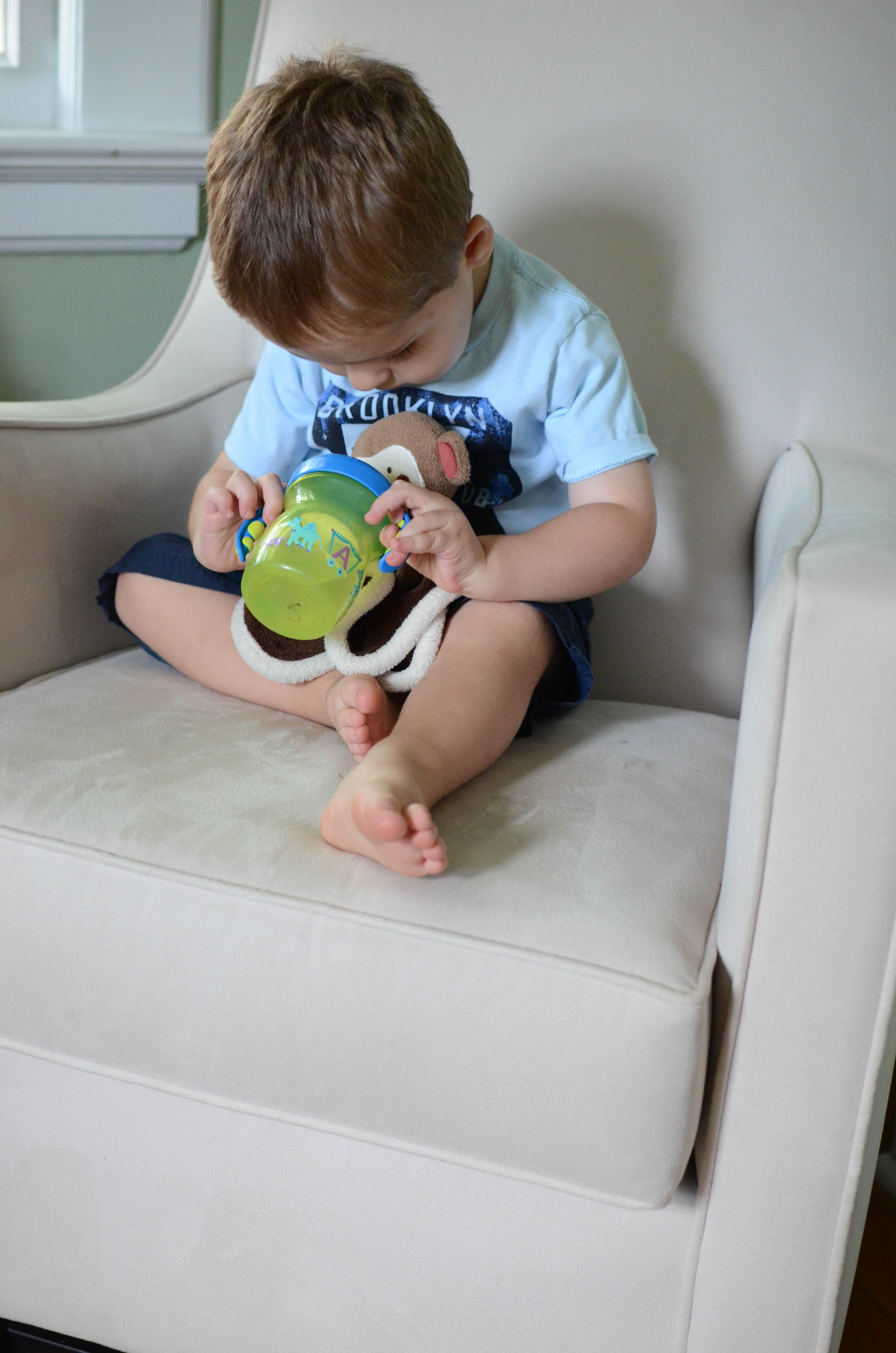J decided it was time for Mike to go to sleep. He laid Mike down, covered him up and gave him his sippy cup.