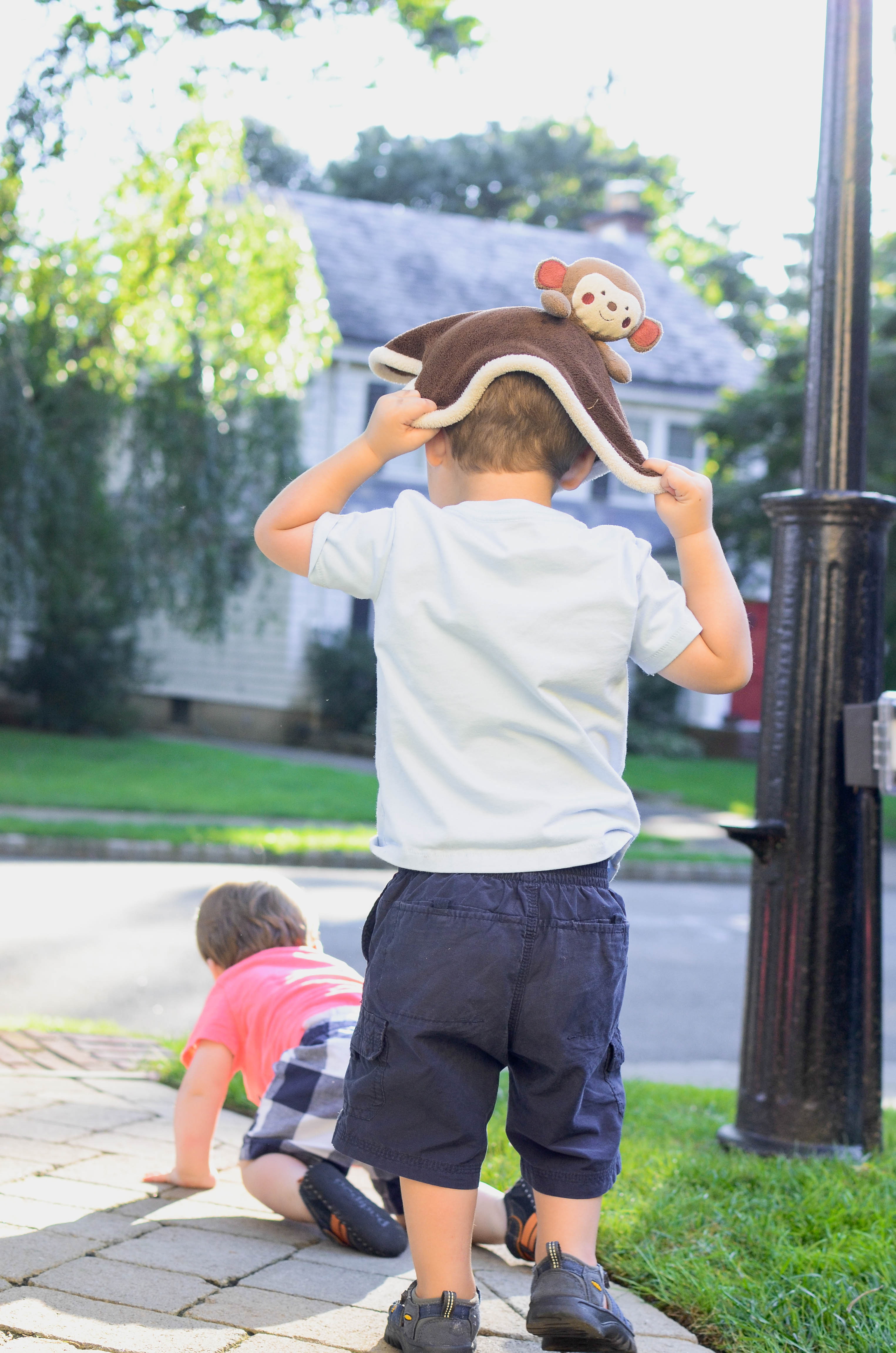 Every little brother enjoys being chased by their big brother with a monkey on their head, right?