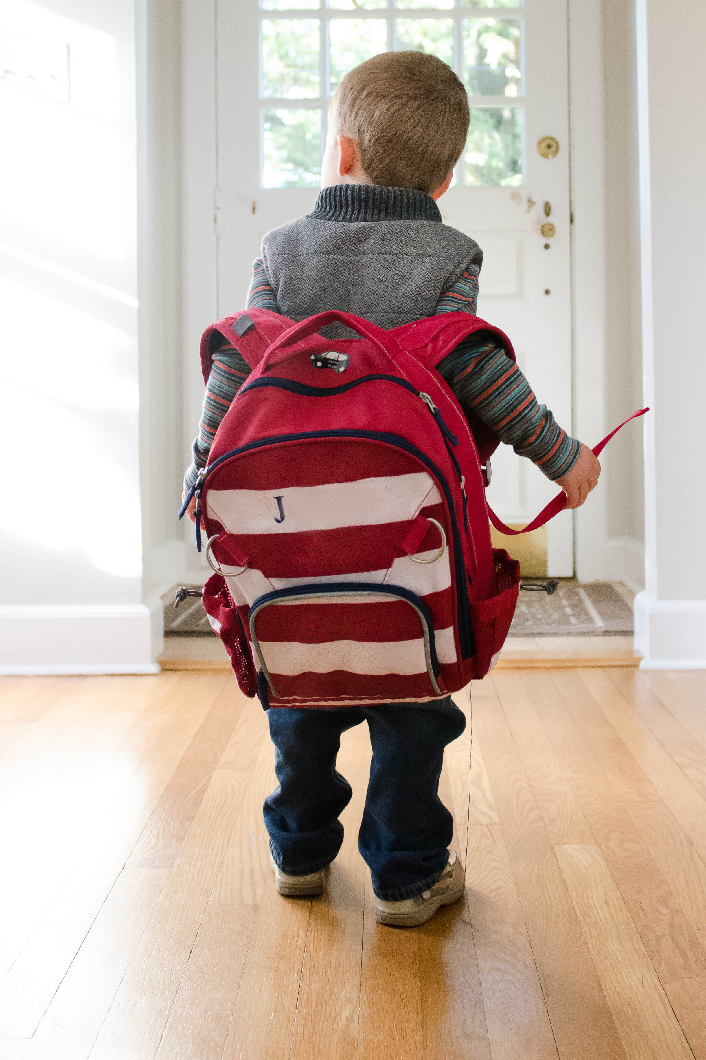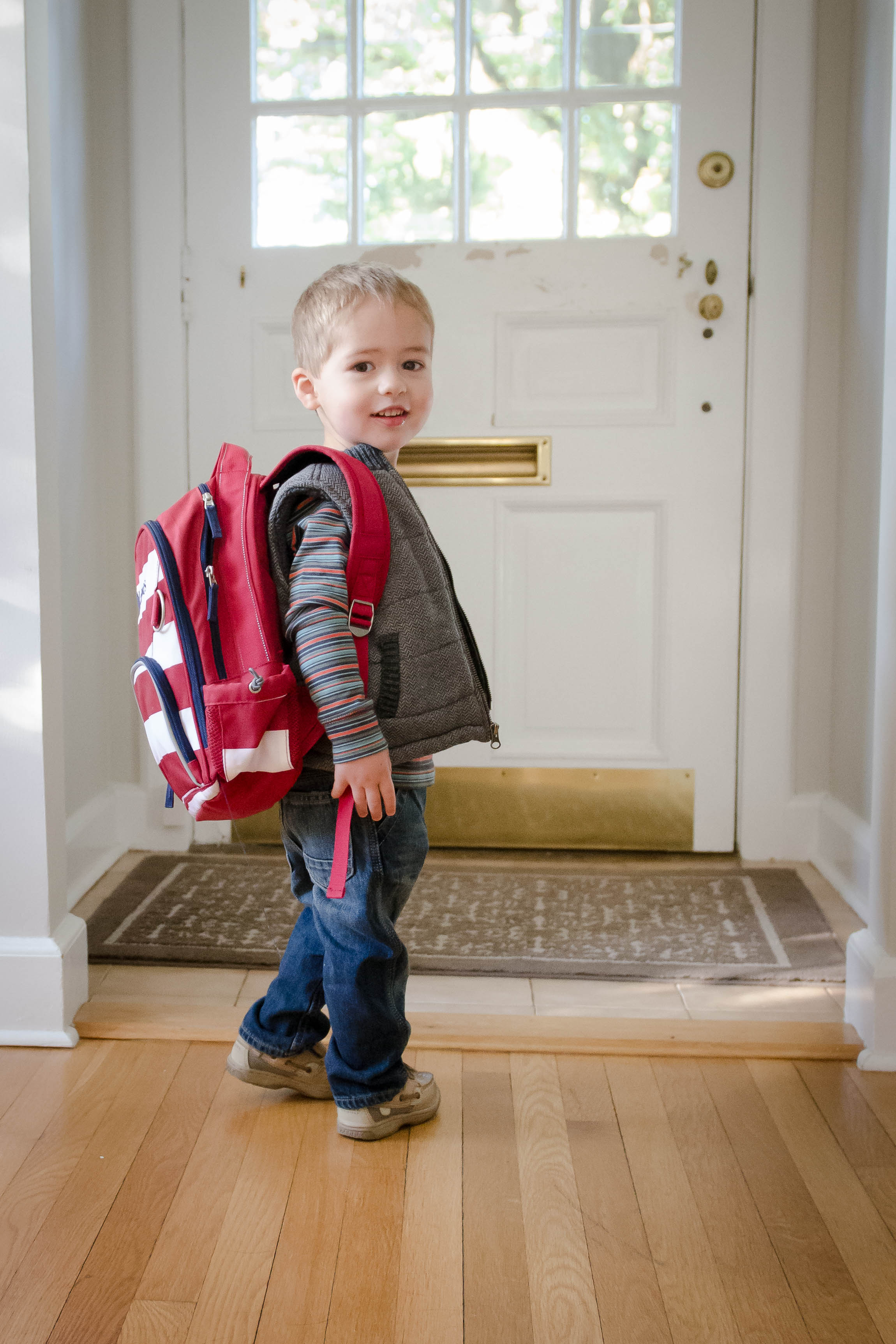 Today was J’s first day of pre-school. I couldn’t be more proud of him – he only cried for a few minutes after we dropped him off and came home with lots of stories and a big smile on his face whenever he mentions his teachers, Mrs R and Mrs K. He was uber excited about his new backpack. And even though they told us that he wouldn’t need a backpack, he took it to school anyhow because he was just so happy about it. We went to the Creamery afterwards for lunch to celebrate the big day and splashed around in some fountains in town.