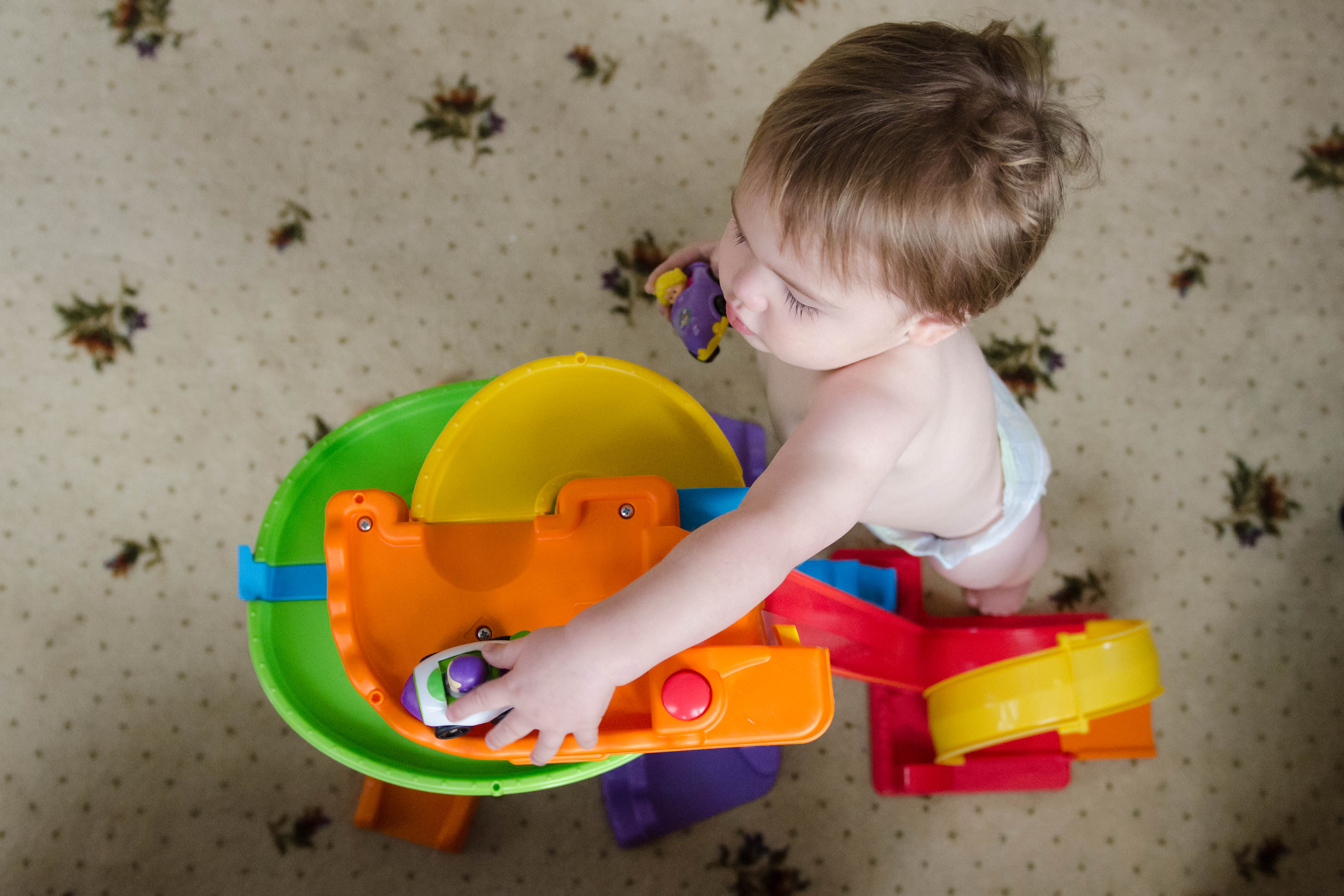 The carpet, of course. NOT the baby. He’s just too cute for words. Working his car ramp as he rocks his diaper.