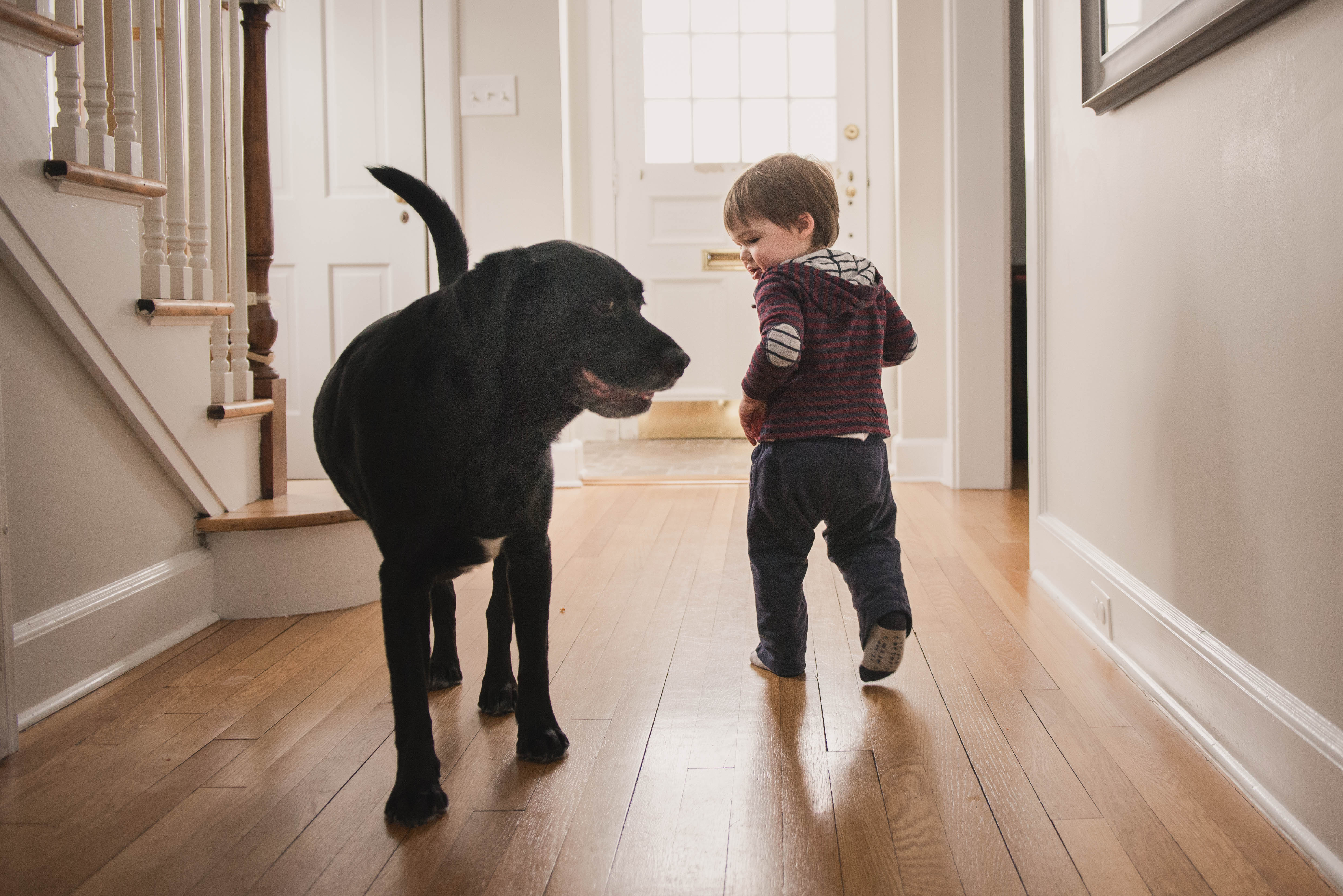He likes to run up and down the hallway with food in his hand and make sure that Bauer follows him back and forth. It is due to this constant taunting of my poor puppy that I only feel partially bad for R when Bauer hits his limit and finally snatches the food out of his hand.