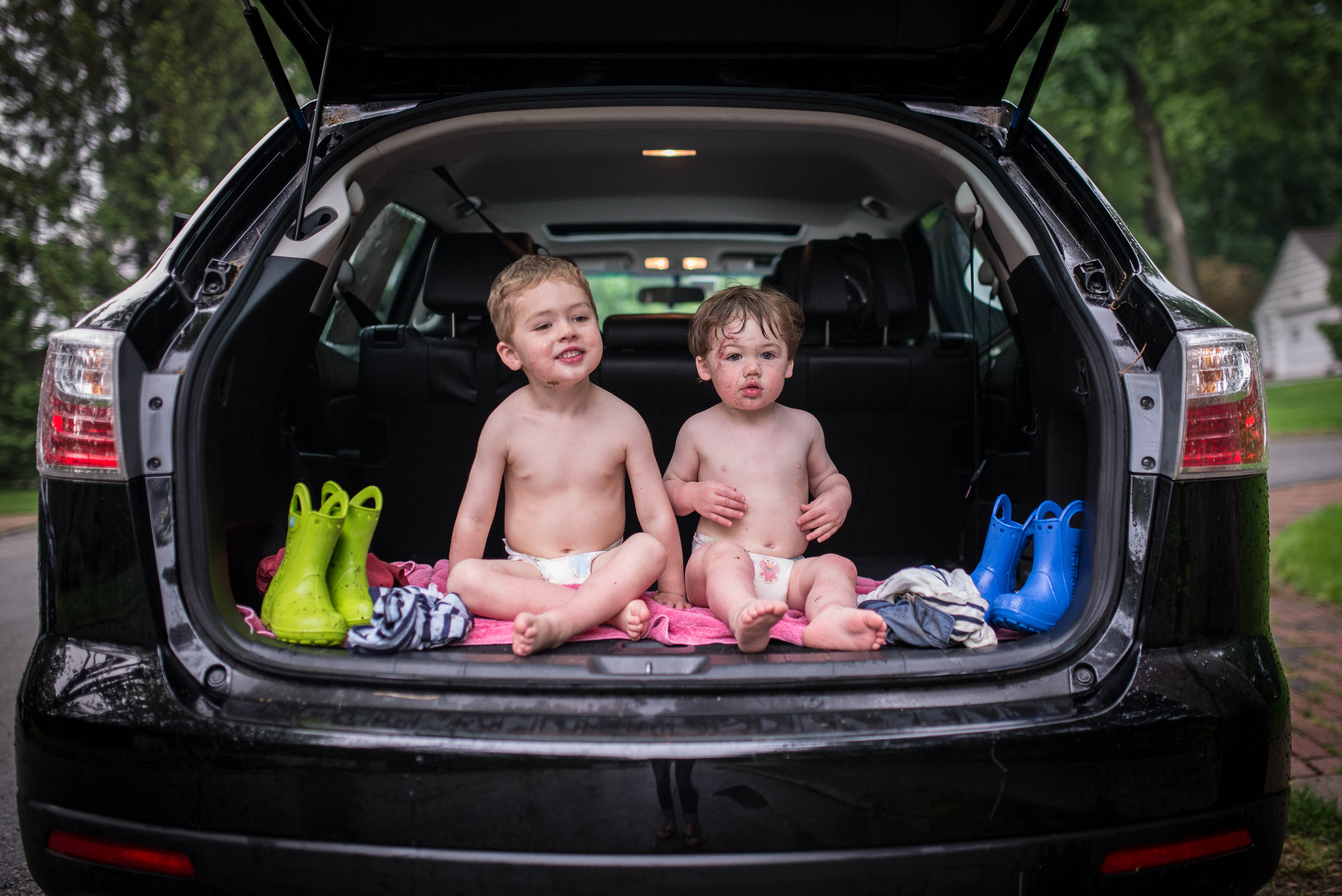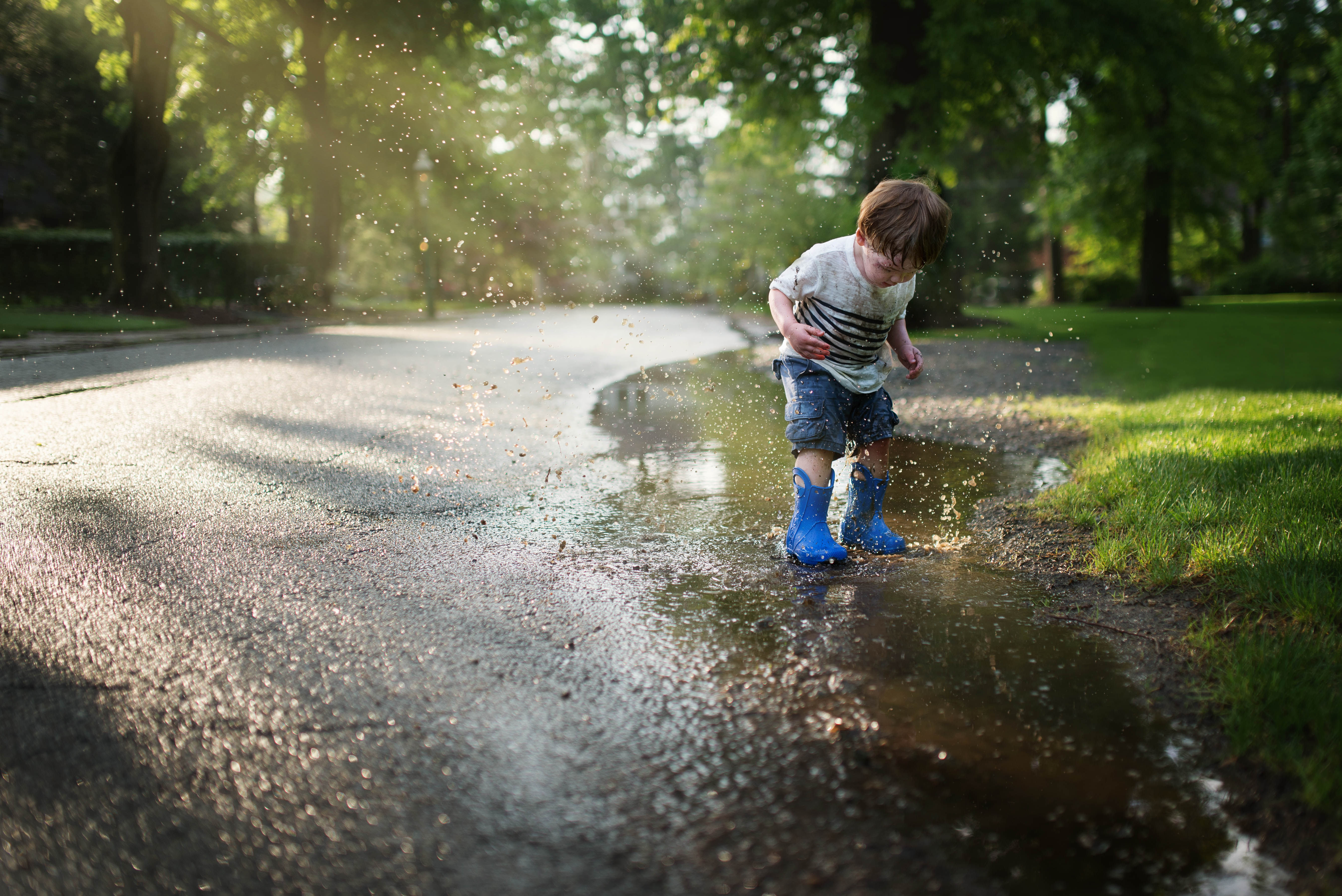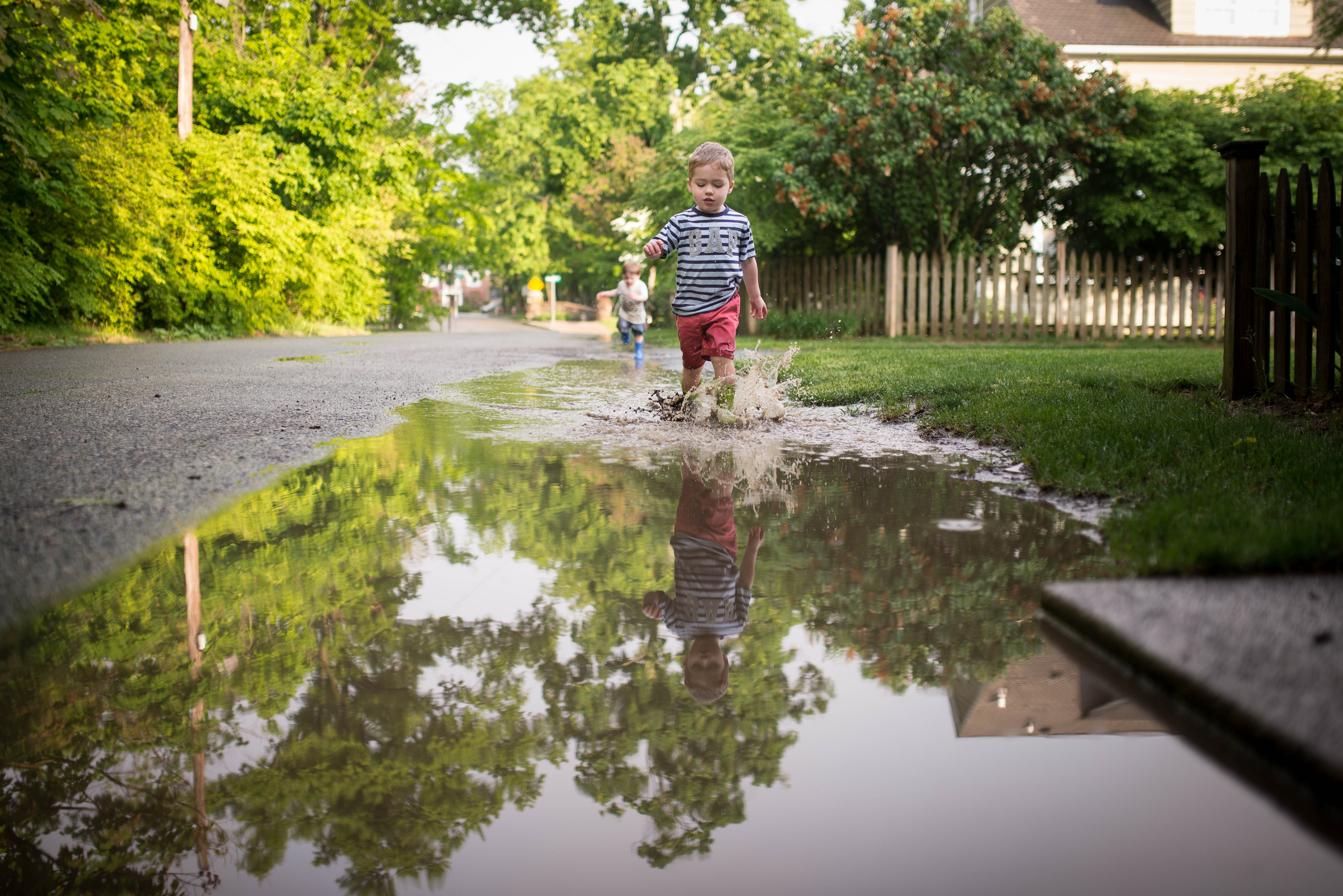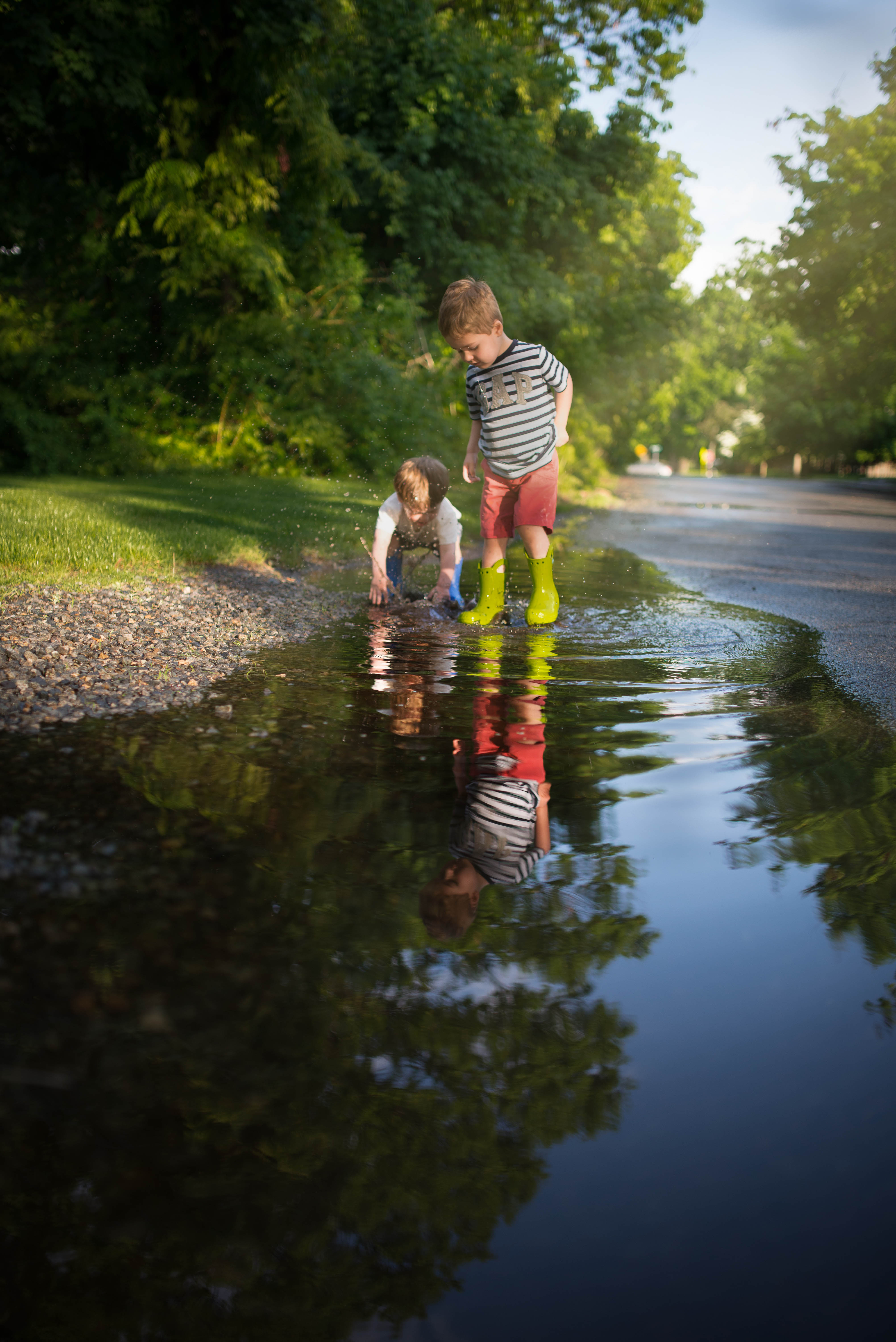 Ever since J got rain boots for his birthday he has been wearing them every chance he gets if the weather is somewhat rainy. Even if it’s just a drizzle. So today, when the sun came out after some fierce thunderstorms, I knew it would be a perfect opportunity for him to really break those bad boys in. And as for R, there was no doubt in my mind this kid would love jumping in the huge and deep puddles that form on a nearby street after seeing him play in tinest little puddles that are created in the divets of our patio stones every time it rains.